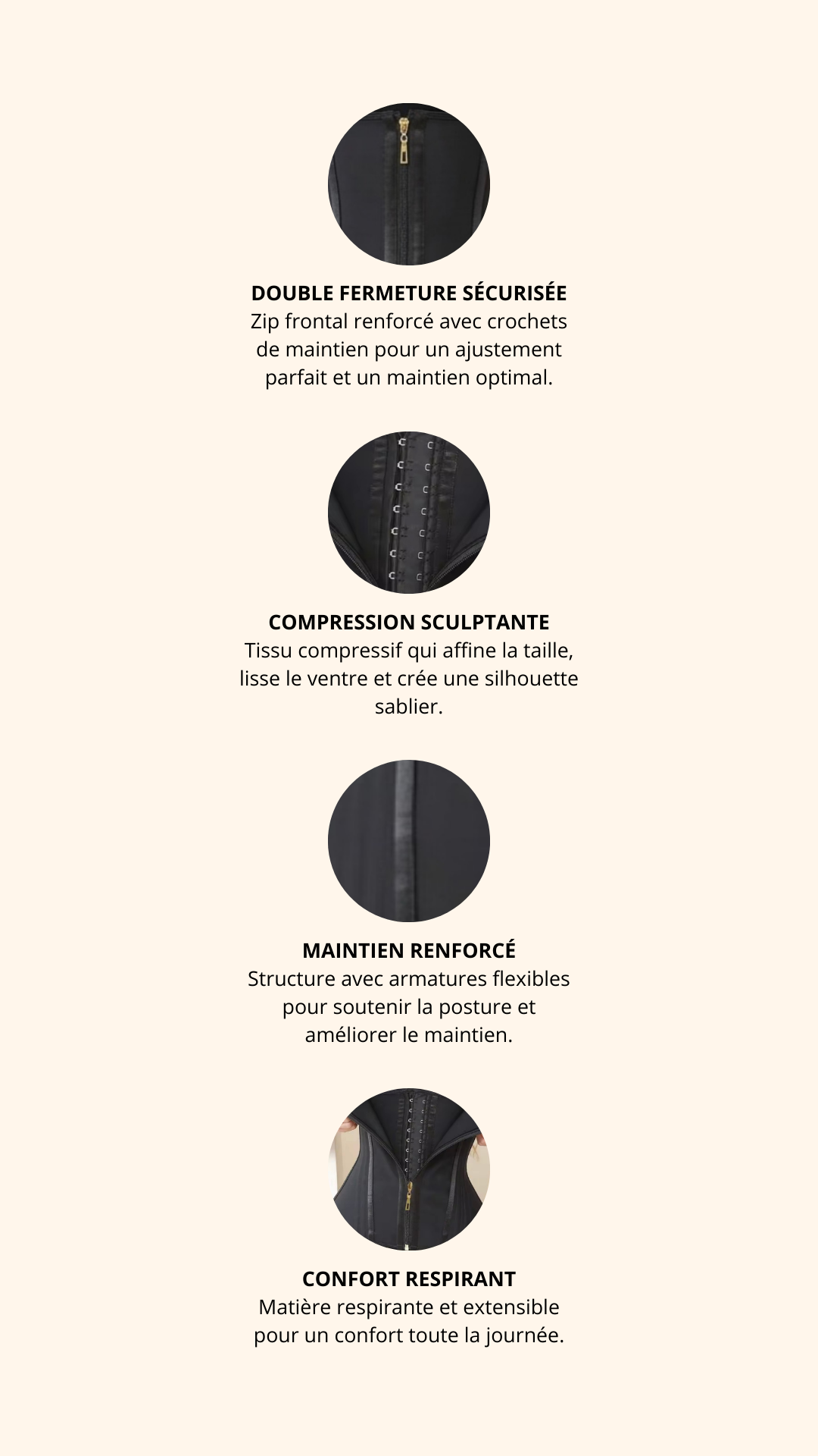 Nous recommandons de la porter 6 à 8 heures par jour pour un maintien optimal et un effet sculptant continu.